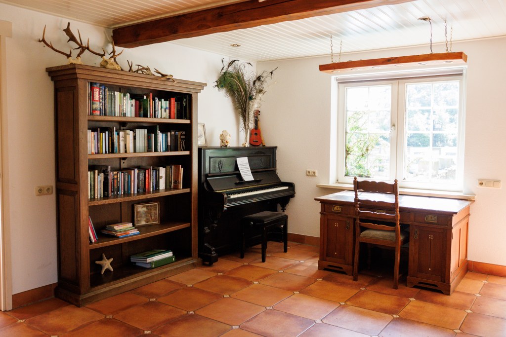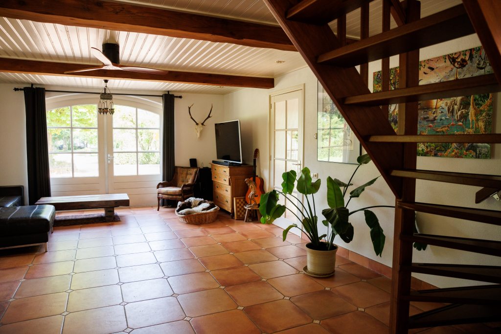 Aan de andere kant bevindt zich een omgebouwde garage. Hier is een tweede woonkamer, zowel als een slaapkamer met badkamer ensuite.